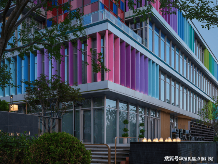 最终的立面呈现以全玻璃幕墙外挂莫兰迪色系的彩虹格栅为表皮语言,街角的跳色彩釉玻璃通高盒子打破立面格栅重复感。简洁的建筑体块、富有韵律的渐变彩虹格栅与韵律感变色灯光融合,在视觉上带给人们全新的感官体验。