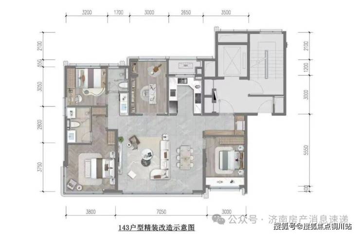 主力户型143㎡做到四室两厅两卫,大宽厅近6.75米搭配落地窗阳台,空间奢阔、采光视野极佳