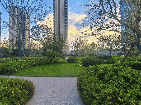 园林实景:景观舒朗有致,从大草坪、灌木、球灌再到乔木,层次丰富的植被、全龄休闲空间、烟波揽境的中轴水景与绿植相互映照,层次丰富,空间感强,就仿佛置身于一幅立体的山水画卷。