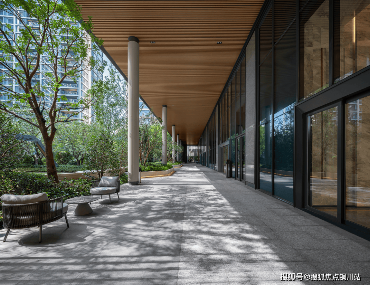 全小区覆盖、约9米高的风雨连廊不仅是业主遮风挡雨的功能区,同时也承担了项目景观空间转换的过渡。