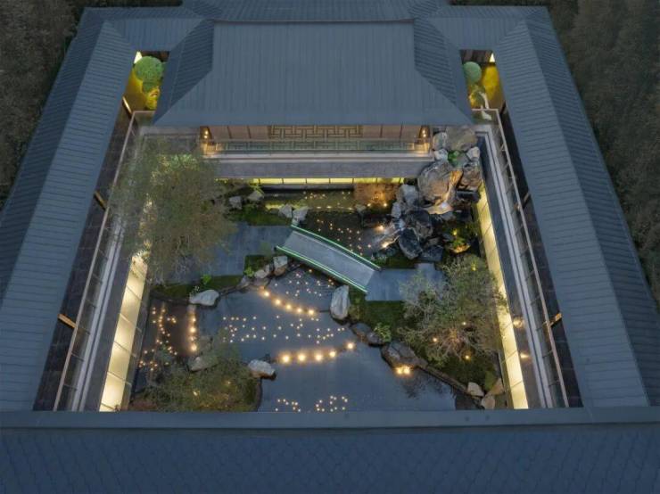 会所与画廊区域相连,下沉庭院采用扬州传统的叠石技法,营造 “山水亭” 主题,带来沉浸式的立体空间体验。一道六米高的瀑布倾泻而下,唤起 “水从天降” 的意境,成为空间的情感核心。