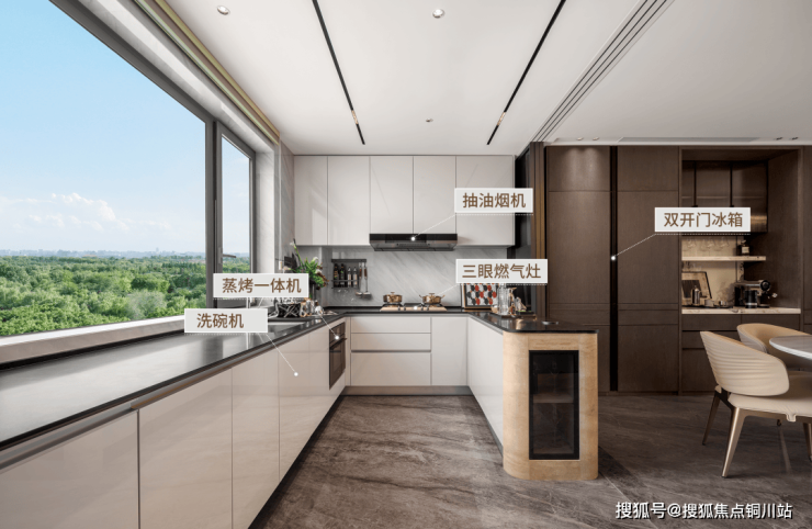 这里还赠送SMEG厨电五件套:抽油烟机、燃气灶、洗碗机、蒸烤一体机、嵌入式双开门冰箱,每一件都是厨房中的佼佼者。