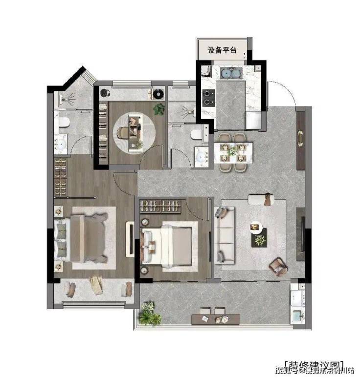 建面约135㎡的“登峯”户型,是四房两厅两卫的改善住房大平层,宽幕设计,就像一个都会取景框,把胥江美景都框进家里。