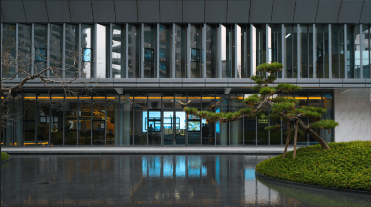 建筑采用公建化立面,2层及以下采用约30mm加厚干挂石材,3层以上以氟碳漆为主,同步搭配大面积玻璃幕墙,提升了建筑的整体档次和美感,自然的质感和高档的外观使得建筑更加庄重和大气;