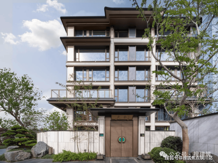 叠墅五层与六层转角处,皆做飞檐形态,轻盈中带有庄重;顶部飞檐及中部飞檐演绎曲檐翼角;飞檐底部以铜色铝板多层叠退,演绎宋式斗拱的支撑意象,既传承古制,又极尽现代工艺之精巧。