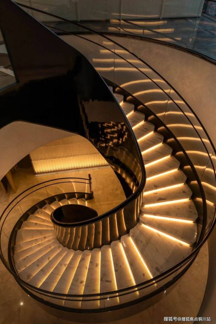 穿过瀑布,沿着螺旋艺术楼梯蜿蜒而下:约1500方下沉式会所。
