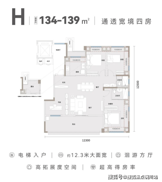 建面约134㎡户型配备独立电梯厅,实现了独梯入户,私享电梯前室。双开间宽幕阳台在南向面宽、LDKB通厅、各房间尺度上都有再提升,约12.3米的巨幅南向面宽,实现边户才拥有的通透性。