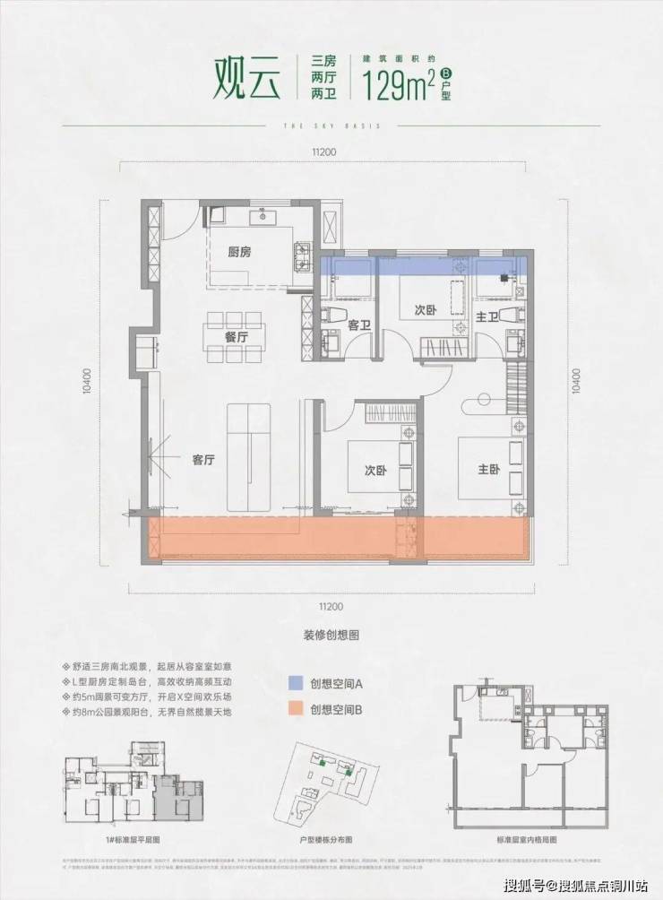 这个是东边户,户型方正,南向开间达11.2米,观景面、采光效果优秀,餐厅部分增加 S墙设计,提升收纳美观效果。