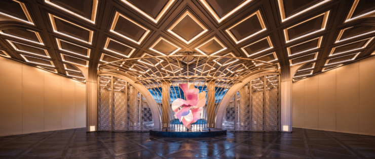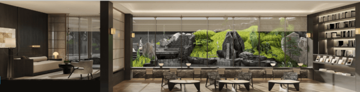 二进庭院则将镜面水景、叠水与瀑布三重水景层层递进,动静交融构建出丰富的多层次景观。并且通过景观,连接了室内外,也联动了上下层空间,传统造园技法中对建筑与自然风物透视关系的拿捏,在这里有了具象的领会。