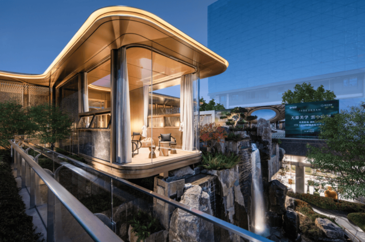 售楼处前后两处下沉庭院,将江南园林的写意挥洒自如,迎宾庭院主打礼序与规制,镜面水景将视线和情绪一同“收敛“,释放出静谧、安定的环境语言,完成归家的心境切换。