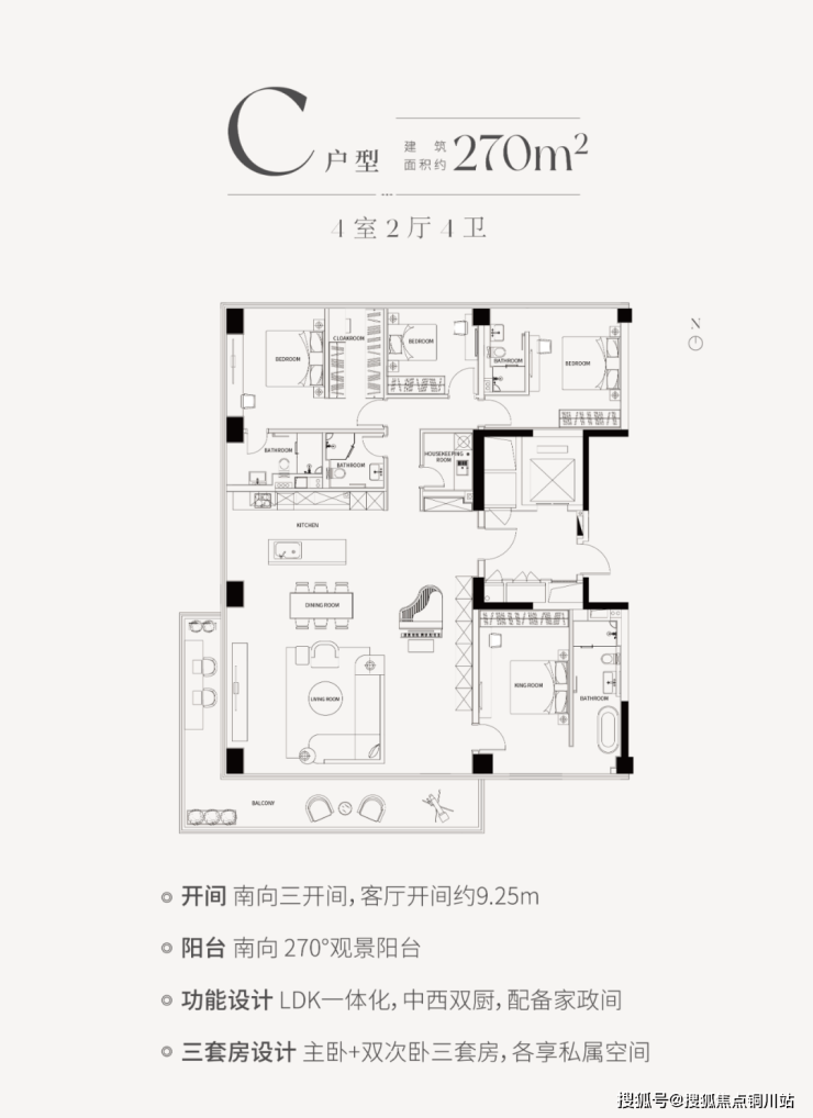 以最出色的270㎡户型为例,四房两厅两卫设计,三套房空间,除承重墙外全落地玻璃幕墙的标准,再加上270°L型超大转角观景,南向客厅9.25米大开间,室内层高达到3.5米,得房率高达85%,可以说放眼无锡市场,除了极少叠墅产品,已无其他产品可与之媲美。