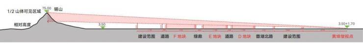 项目位于寄畅园北面,与龙光塔直线距离1公里,位于龙光塔视线通廊范围内,具有天然地理优势。以黄埠墩人视点与山体高度75m 为半径辐射形成核心可视区,每个视点与核心可视区相切形成的区域为视廊核心区,区域内控制建筑高度形成景观廊道,保证可见山体高度为主要山头1/2 高度以上。