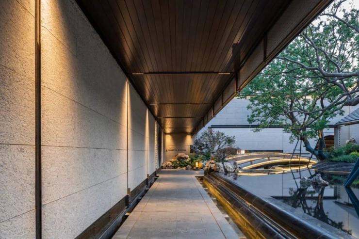 游廊设计灵感源自无锡寄畅园的“清蘌回廊”,廊墙之上开凿圆形墙洞,水底以宋代米芾《研山铭》为蓝本,采用白玉嵌金工艺铺就,既传承了文人赏石的雅致传统,又通过现代技法赋予水景金石韵味,负阴抱阳,虚实相生。