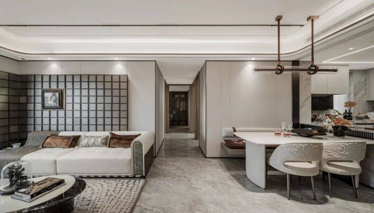 餐客厅踢脚线和厨房门框均为金属材质,开关面板全部定制同色系,把房屋美学做到极致……