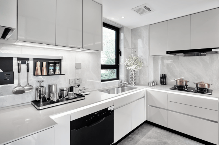 在厨卫方面同样甄选全德系TOP级精装品牌,包括西门子的壁挂式油烟机、大火力燃气灶、嵌入式洗碗机,唯宝的一体化智能马桶(主卫),高仪的恒温淋浴系统、面盆、龙头等。