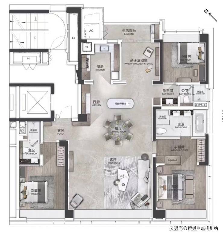 这种空间的越级感,你也可以在建面约236平的户型上感受到。