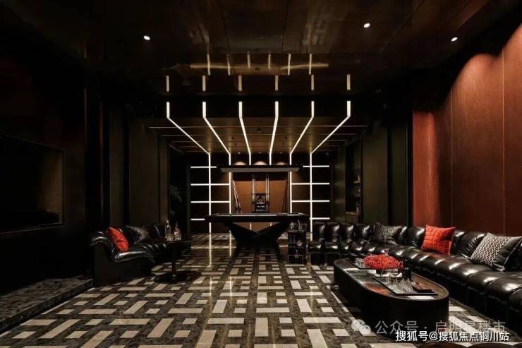 在审美上,项目也是领先级的。PARTY ROOM的涵盖了KTV、桌球等功能空间,沿用了美国别墅区豪宅的做法,发光玉石、雀眼枫木天花板、地面范思哲黑+木兰灰水刀拼花,用材和工艺都十分考究。