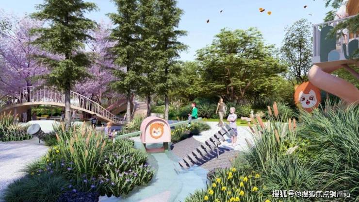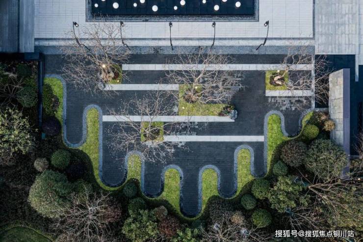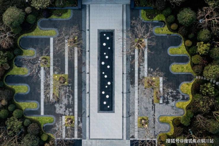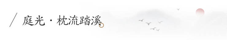 伴着潺潺水声,行至中庭,道路两侧绿意葱茏,展开一段唯美的空间画卷。景观提取江南的浪漫精神与特质,城市的喧嚣消失殆尽,现代闲适的情境意趣油然而生。