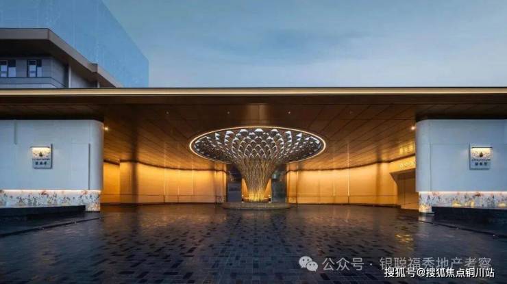 约250米长的超长景观墙界面,以及42m宽、4.8m高的仪式感门厅,入口采用酒店式环岛落客,中心设置寓意「天下四聚」的艺术装置,不仅展现出归家的蕴贵门面和仪式感,还与苏扇工艺打造的黄金池底基座互相辉映。