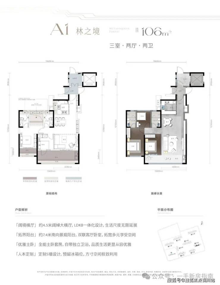 另外的两个户型,建面约106㎡的三室是首开105㎡爆款升级版,房源充足,圆了首开未购者的心愿。