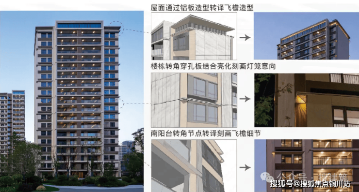 外立面通过细节元素诠释东方语言:屋面通过造型转译飞檐造型、楼栋转角穿孔板结合亮化刻画灯笼意向,而“灯笼”象征着万家灯火、张灯结彩,将东方意境以现代手法融入到项目建造中。