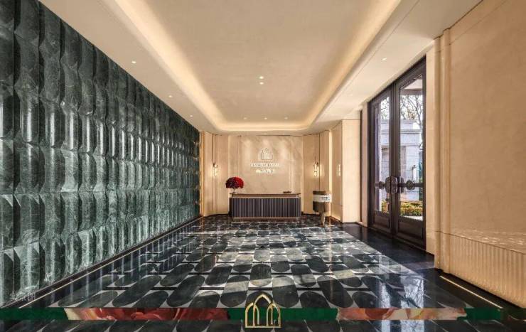 步入华贵大堂,地面以墨绿、雅黑、玉白三色石材拼花铺装,方形、椭圆形交错的纹饰图案,勾勒出层次分明且富有艺术感的效果。