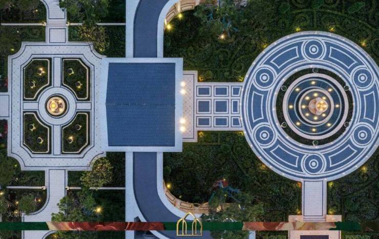以凡尔赛宫园林为蓝本的东西向仪式花园中轴,串联水景喷泉、礼仪树阵、艺术花廊等,于礼序中彰显皇家庄严威仪。