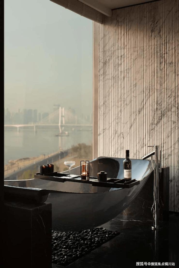立面为全玻璃幕墙,辅以灰色层间铝板线条及香槟色浪花造型,写意江面星星点点的波光效果,打造立面层次感,增加精致度,同时结合近3米长转角圆弧的宽幅玻璃幕墙,形成室内外无界场景,揽江入室。