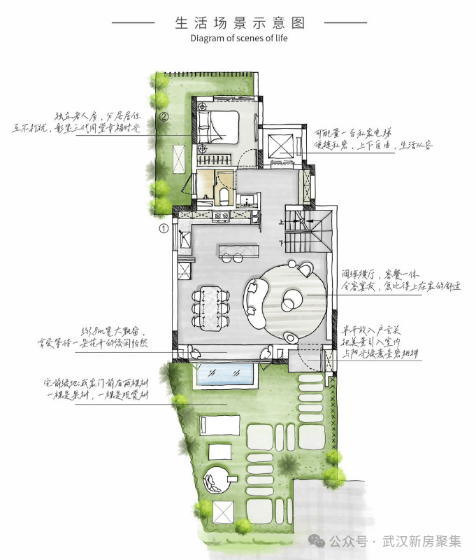 上叠星空露台,星月相伴,望湖之静美、山之苍翠;下叠专属花园,莳花弄草,享自然之静、闲暇时光。