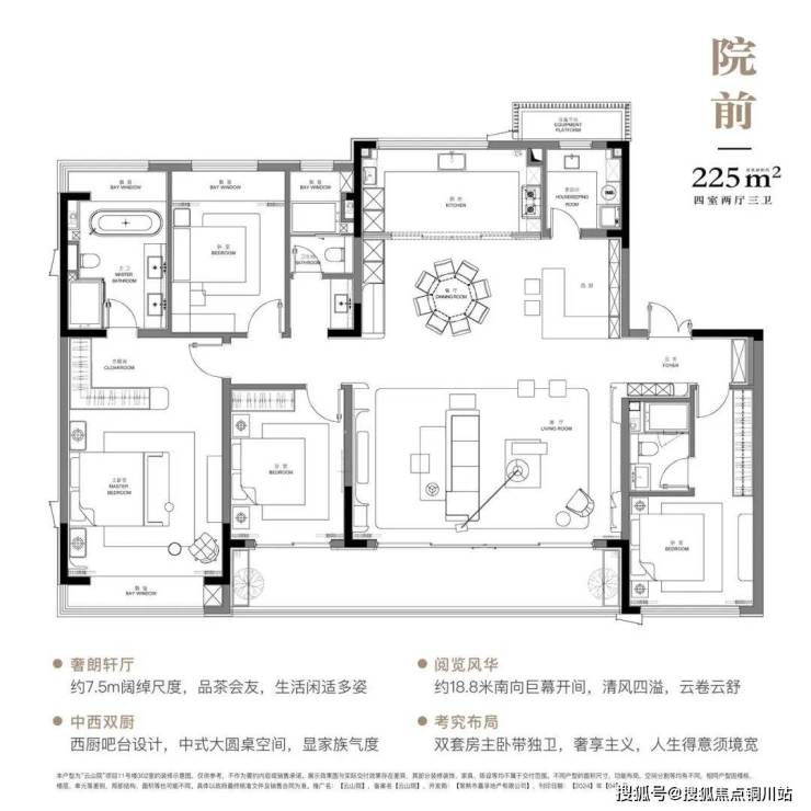 约225㎡户型,客厅面宽达到约7.5米,整体南向开间更是达到约18.8米,尺度那是一点问题没有!该户型还配备了中西双厨、南向双联阳台、双套房,不过这种尺度感,还是要去现场体验一下!