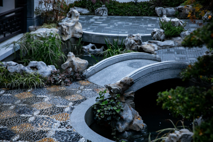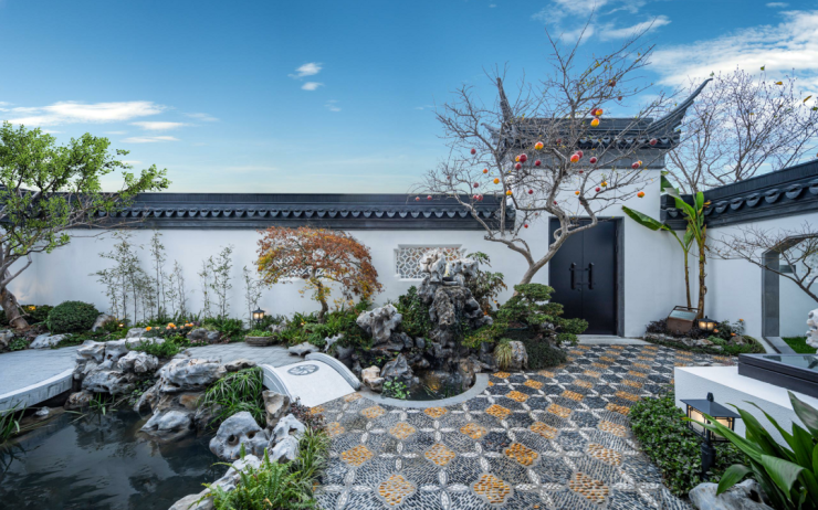 以苏扬园林为母本,凤鸣隐庐园林设计,提取何园“园林建筑、叠石掇山、精巧花窗”的元素,借鉴小盘谷“以少胜多”、“小中见大”的艺术手法,通过亭院楼阁、飞檐翘角、花街铺地等中式构件及造园手法,为扬州营造一处“得闲世外桃源,寻味人间风雅”的“城市山林”。