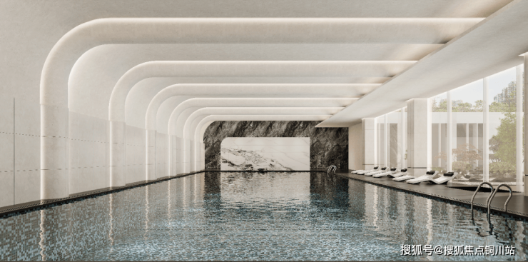 以恒温泳池为例,泳池的玻璃幕墙外,是下沉庭院的风景。业主游完泳后,在休息椅上观瀑听泉,这是兆地锦绣春秋为业主量身打造的独属松弛感空间。