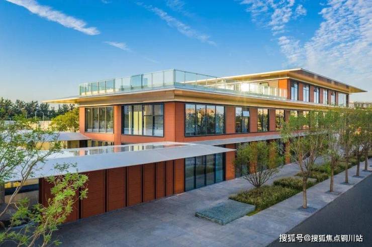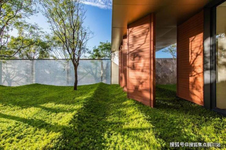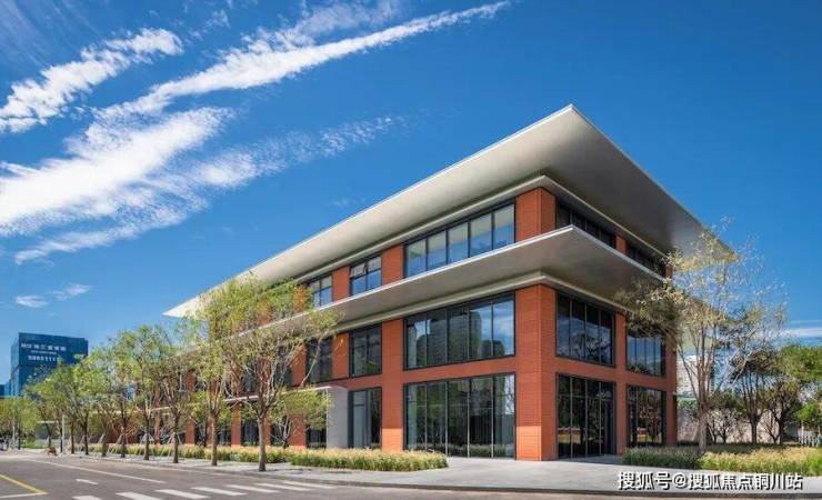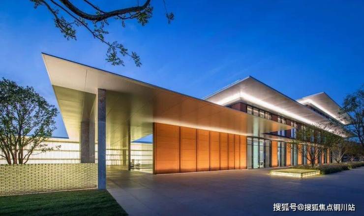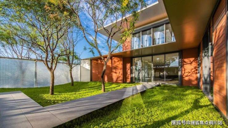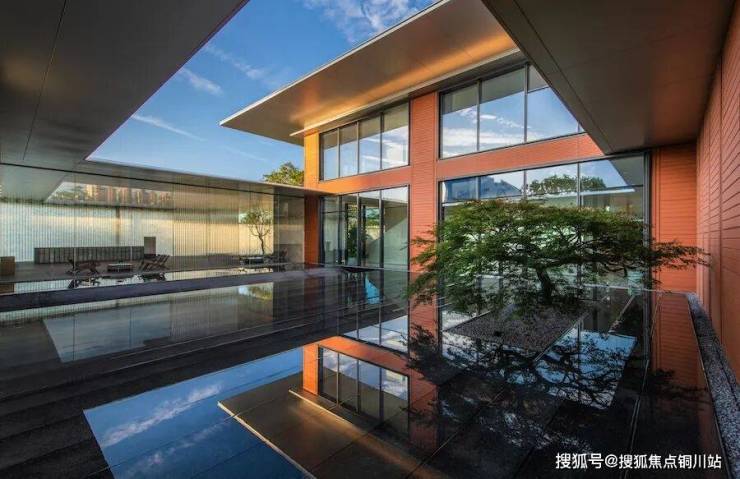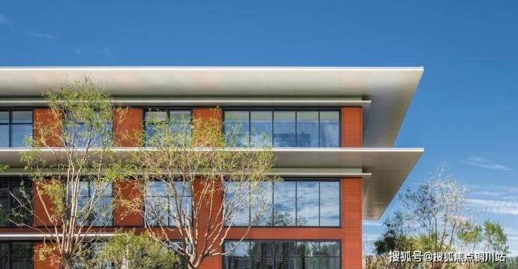 项目墙面选用了红色陶板,与现代感十足的大面积玻璃基本没什么违和感,加以水平向大尺度的月光银铝板密拼挑檐,整体呈现现代、隽永的风格。