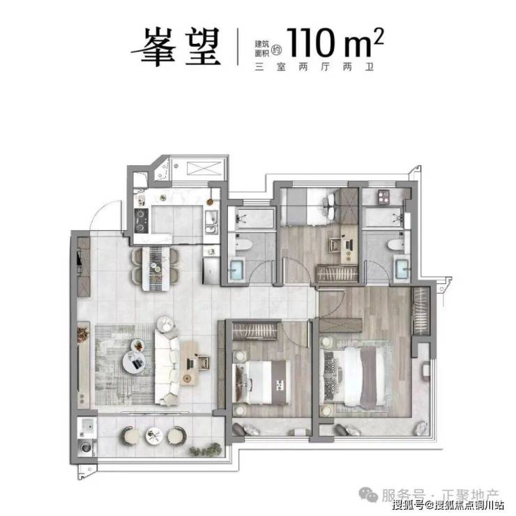 A户型 峯望 三室两厅两卫 | 建筑面积约110㎡,阔景宽幕三居|全南京唯一110㎡内阳光主卧270°观景采光