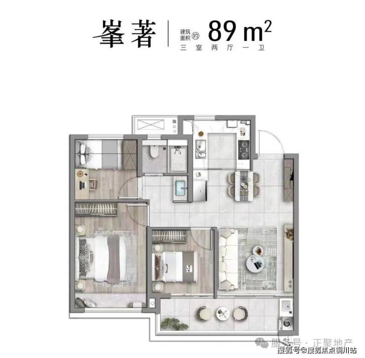 B户型 峯著 三室两厅一卫 | 建筑面积约89㎡,一字型酒店式入户|预设岛台西厨
