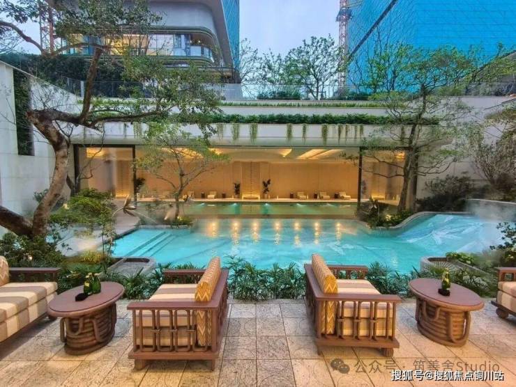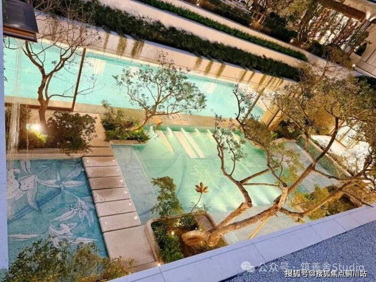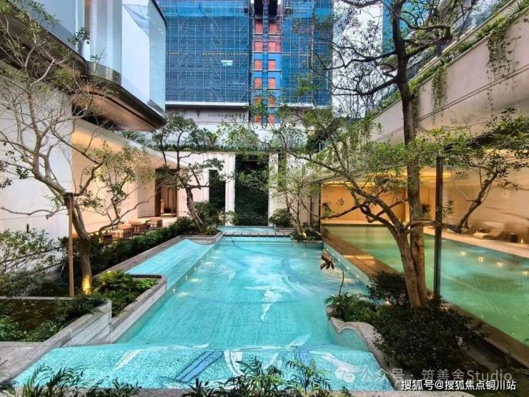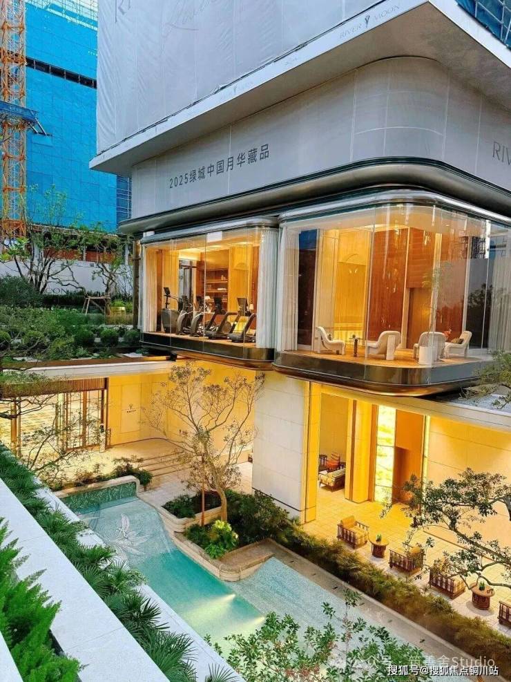 以《红楼梦》中“大观园”为灵感,蕙澜月华打造一座立体叠合的山水园林,通过山水意趣的象征表达与建筑即景的精巧融合,呈现“芥子须弥,小中见大”的东方美学意境。约320米的下沉式庭院,仿若山谷溪涧,营造出“瀑布挂崖间,飞空作碧玉”的壮丽景观;室内恒温泳池与室外嬉水池间,采用可开可合的设计,模糊内外界限,实现自然与建筑的和谐共生。有氧健身空间以“玻璃盒子”的挑空姿态,悬浮于下沉庭院之上,为运动者带来开阔视野。在这里,健身的先生、游泳的太太、嬉戏的孩子,既各享其乐,又共享视线中的陪伴,多维场景的高频互动,诠释了奢华的真谛——不仅是空间,更是情感的交融。