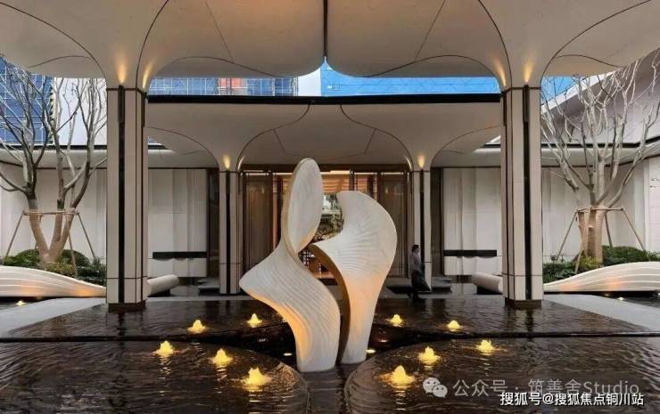 下沉式庭院巧妙借鉴自然山谷的形态,以叠水、绿阶、浮岛等元素精心构筑,呈现“飞瀑挂崖”的生动景致。庭院中央的女王画舫若隐若现于林水之间,业主可在此品茗赏景,尽享“都市女王”般的优雅与从容。