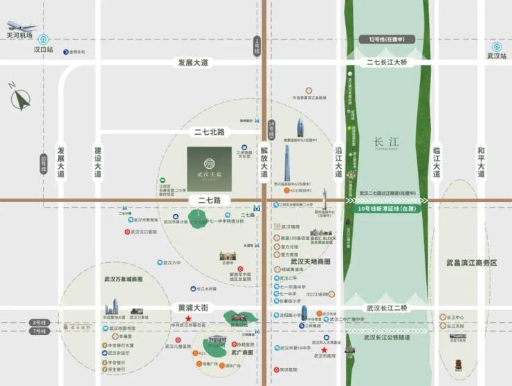 大型商业综合体武汉天地、壹方南馆、壹方北馆,构筑全业态商业系统,平安金融中心、环球智慧中心、武汉企业天地1号等近20家世界500强、60余家外资及合资企业,强势铸就二七滨江价值高地。