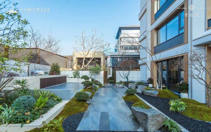 维纳多白,落笔于社区大门及下沉庭院墙壁之上,暖白基调和温润质感勾勒出东方意境;