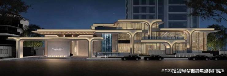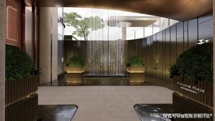 “超级树冠”界面的C位,是长约30米的大门头,搭配净空约8.5米的大堂外门吊顶。C位的画龙点睛处,约13米落差的建筑瀑布随阳光洒泻而下,灵动和亲和中还夹带着负氧离子。