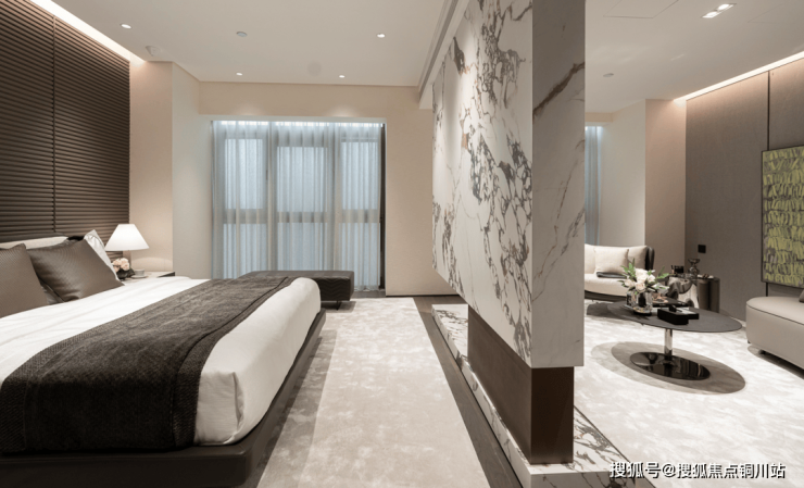 特别是主卧,总统级套房配置,双开门,让主卧更有日常生活的仪式感。除了传统的功能布置,还留有休憩区、沙发区等设计空间,构筑了独立的精神世界。
