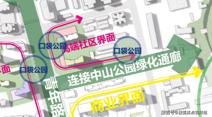 贯通的绿化带与多点放置的口袋公园及公共绿化空间;