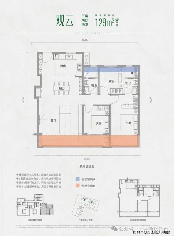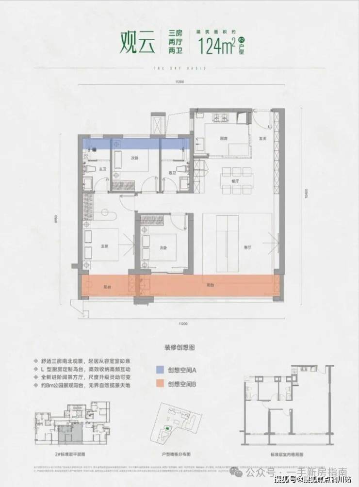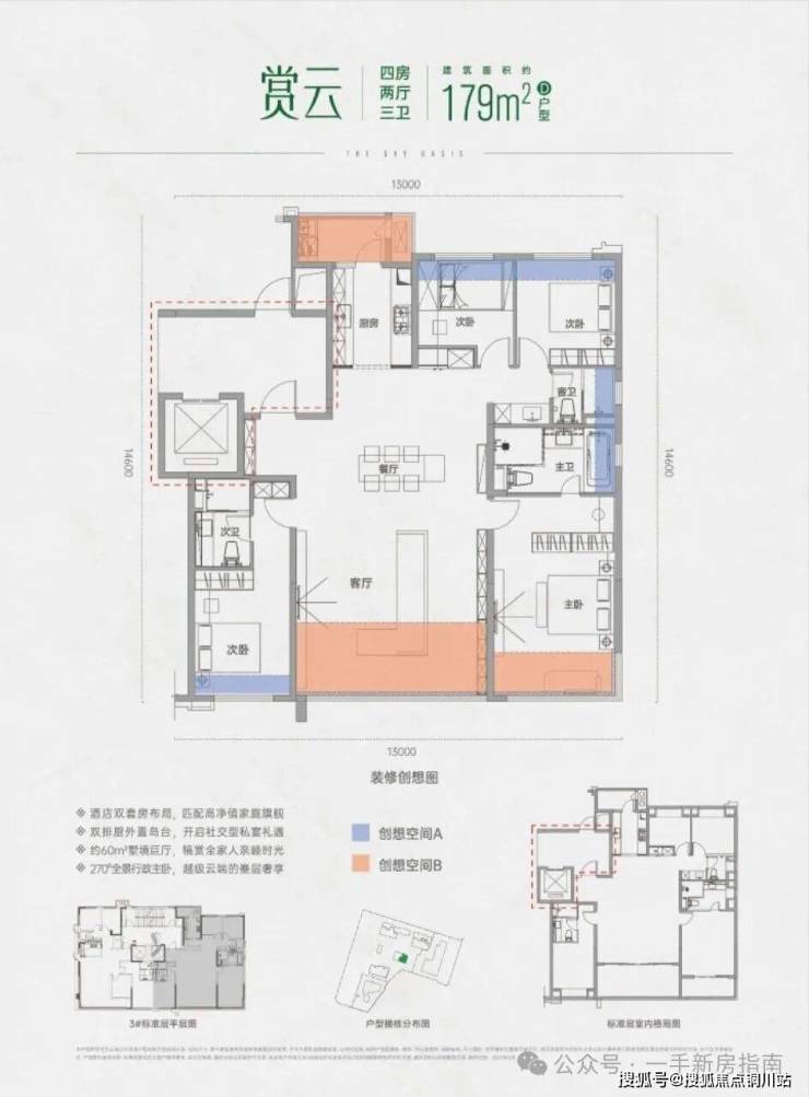 根据户型分布平面图来看,该户型所在楼栋为3梯4户格局,双连廊设计,该户型位于楼栋边户,南北通透,三开间朝南,南向有连接次卧和客厅的大阳台;户型比较方正且动静分区较好,但是过道有点浪费面积,另外根据户型图显示,该户型可以做到一梯一户的居住体验。