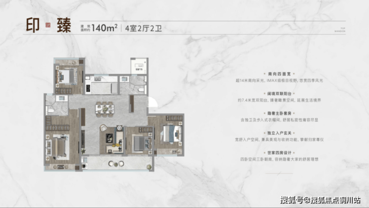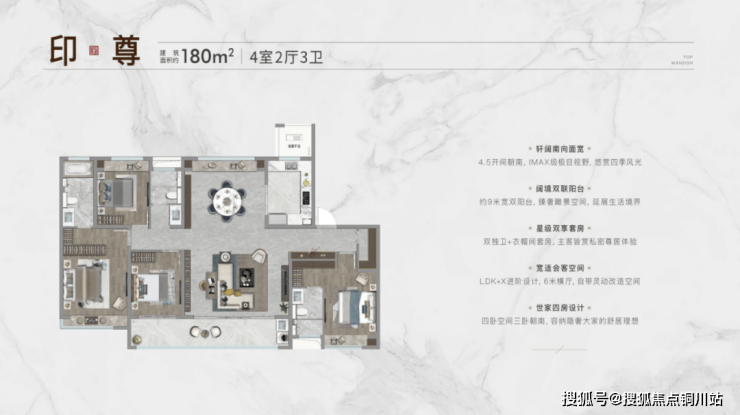 建面约180㎡,4房2厅3卫: 4.5开间朝南,阳台达到惊人的9米,不得不说尺度够阔绰。南向客卧套房设计,收纳也更从容。
