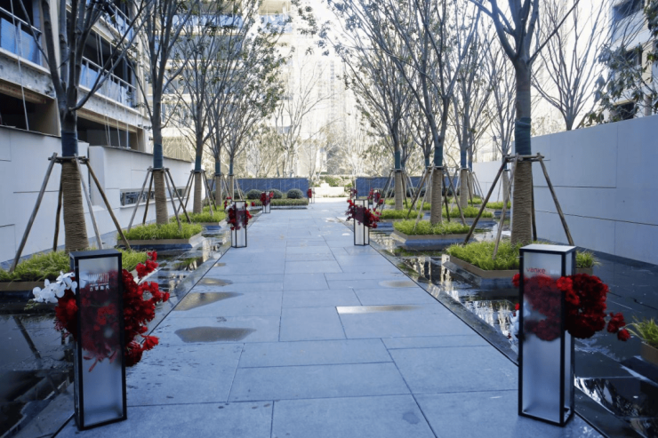 园中还栽种了价格昂贵的色叶树王——羽毛枫,迎宾水庭上遍植榉树,中央草坪及景观会客厅种了丛生乌桕,这些珍贵树种所营造的独特风景游廊,形成一种区别于普通住宅的雅奢生活质感。