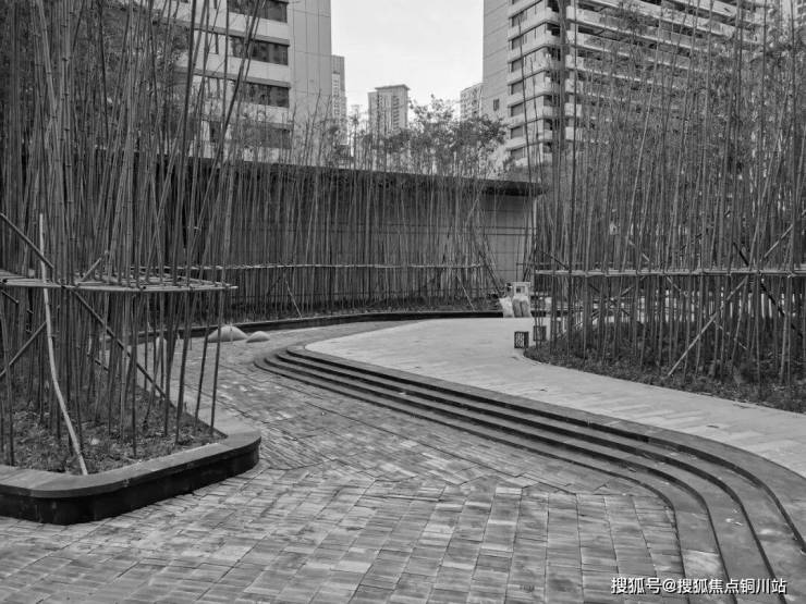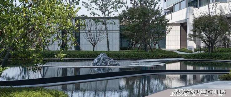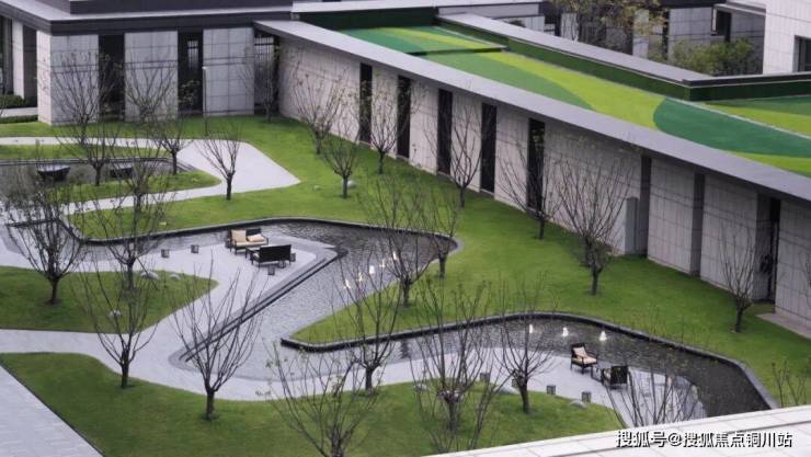 一期曲水浣溪设计原为新中式曲径竹林,呈现清幽、中式美感,迭代后竹林调整为日本晚樱,整体效果更为现代、简约,亲水性更强。