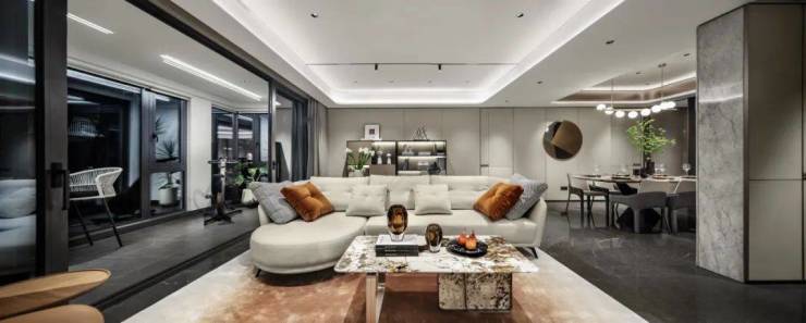 厨房设计:厨房最大面宽做到约 4.8 米,最小面宽也达到了 3.95 米,格局方正匀称,奢阔而明亮。建面约 220㎡、250㎡高改户型,还精准搭配尺度合宜的中岛台,可作为西厨操作台、收纳空间、隔断空间或交流平台。