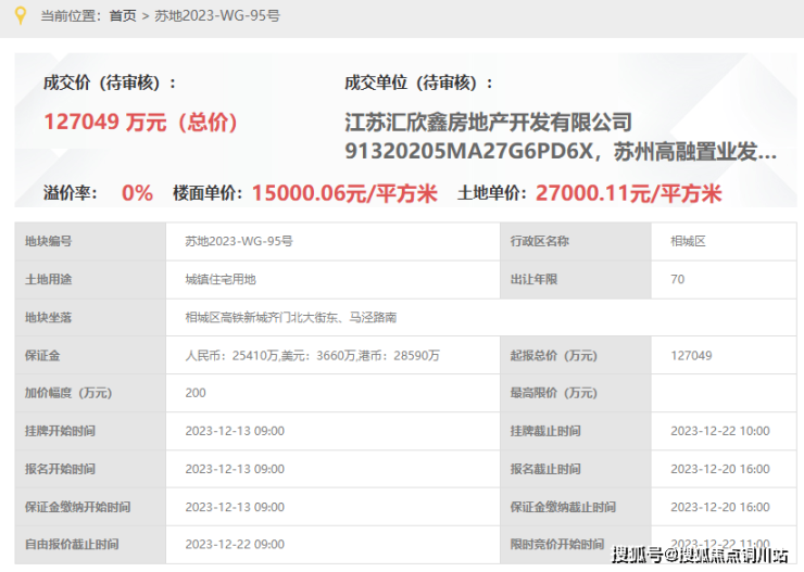 金地玖峯汇,即,苏地2023-WG-95号地块,位于相城区高铁新城齐门北大街东、马泾路南,是2023年12月22日,汇欣鑫房地产&高融置业以底价127049万元竞得,成交楼面价15000元/平。