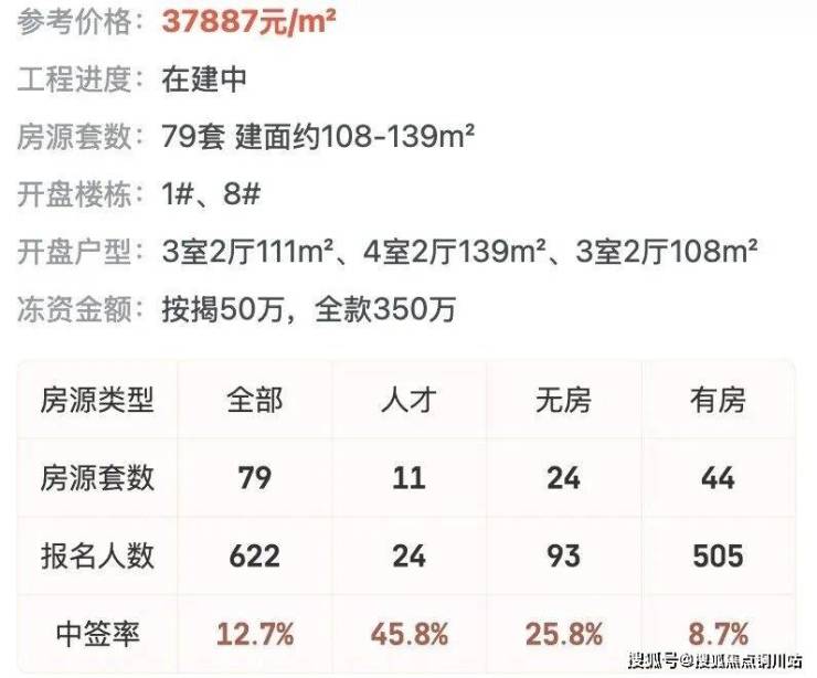 项目示范区开放3天就取出首张预售证,11月18日迎来首开,推出1#、8#两幢共79套房源,成交均价为37887元/㎡。当期共吸引622组家庭登记,中签率低至12.7%。