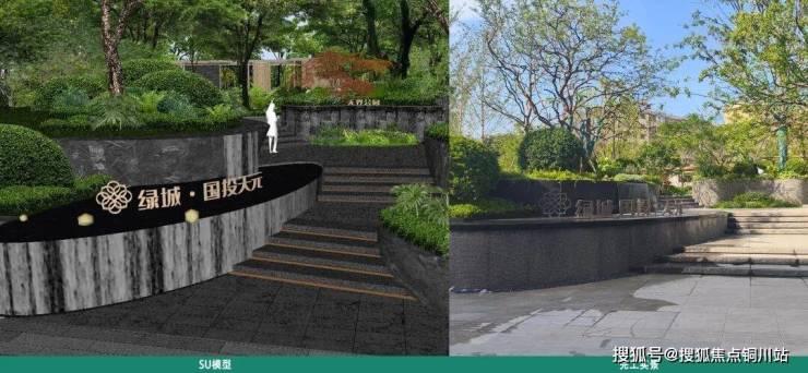 ▲中央草坪效果图及实景图